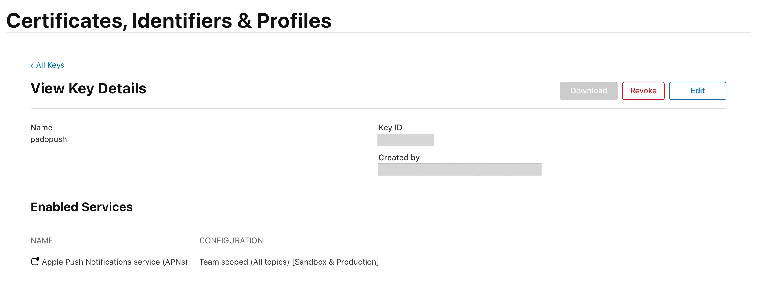 이후 Certificates, Identifiers & Profiles 의 keys 항목에서 키를 발급해야 한다. 키는 외부 서비스가 애플의 권한(ex) 푸쉬, 애플 로그인 등)이 필요할 때 애플 서버에게 자신을 인증하기 위한 비공개 키 파일이다. 애플 서버는 외부 서비스의 키 파일을 보고 해당 서비스가 인증되었음을 확인한다. 현재는 FCM 이 APNs 에 직접 요청을 보내기 때문에 FCM 에게 키 파일을 주어야 한다. 생성 시 Apple Push Notifications service (APNs) 권한을 주면 된다.