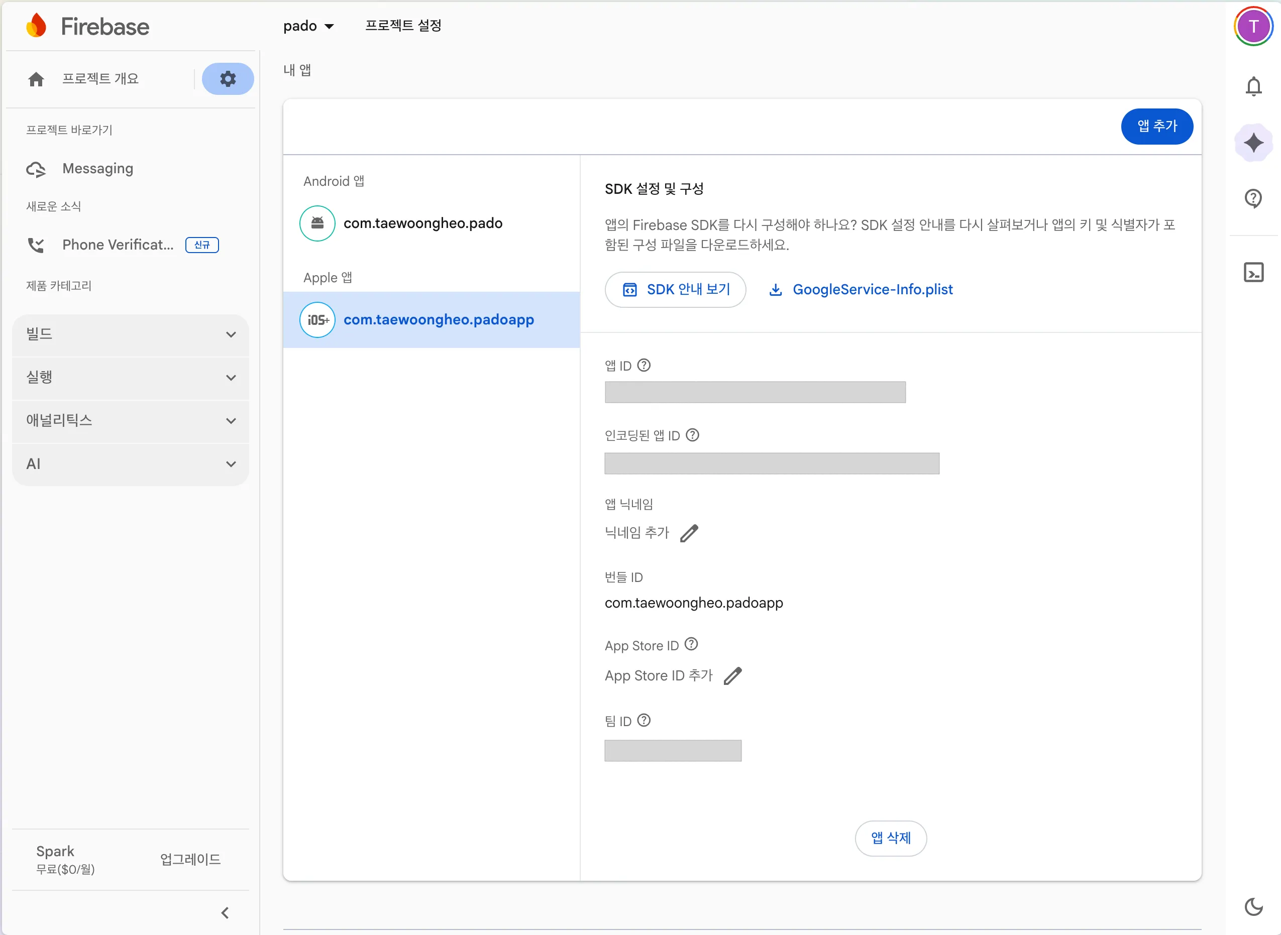 이제 Firebase Console 로 이동하여 프로젝트를 생성 후 iOS 앱을 하나 만든다. 이때 iOS 앱의 bundle ID 는 푸쉬 알람 권한을 갖고 있는 앱의 bundle ID 와 정확하게 일치해야 한다. GoogleService-Info.plist 도 다운로드 받아준다.