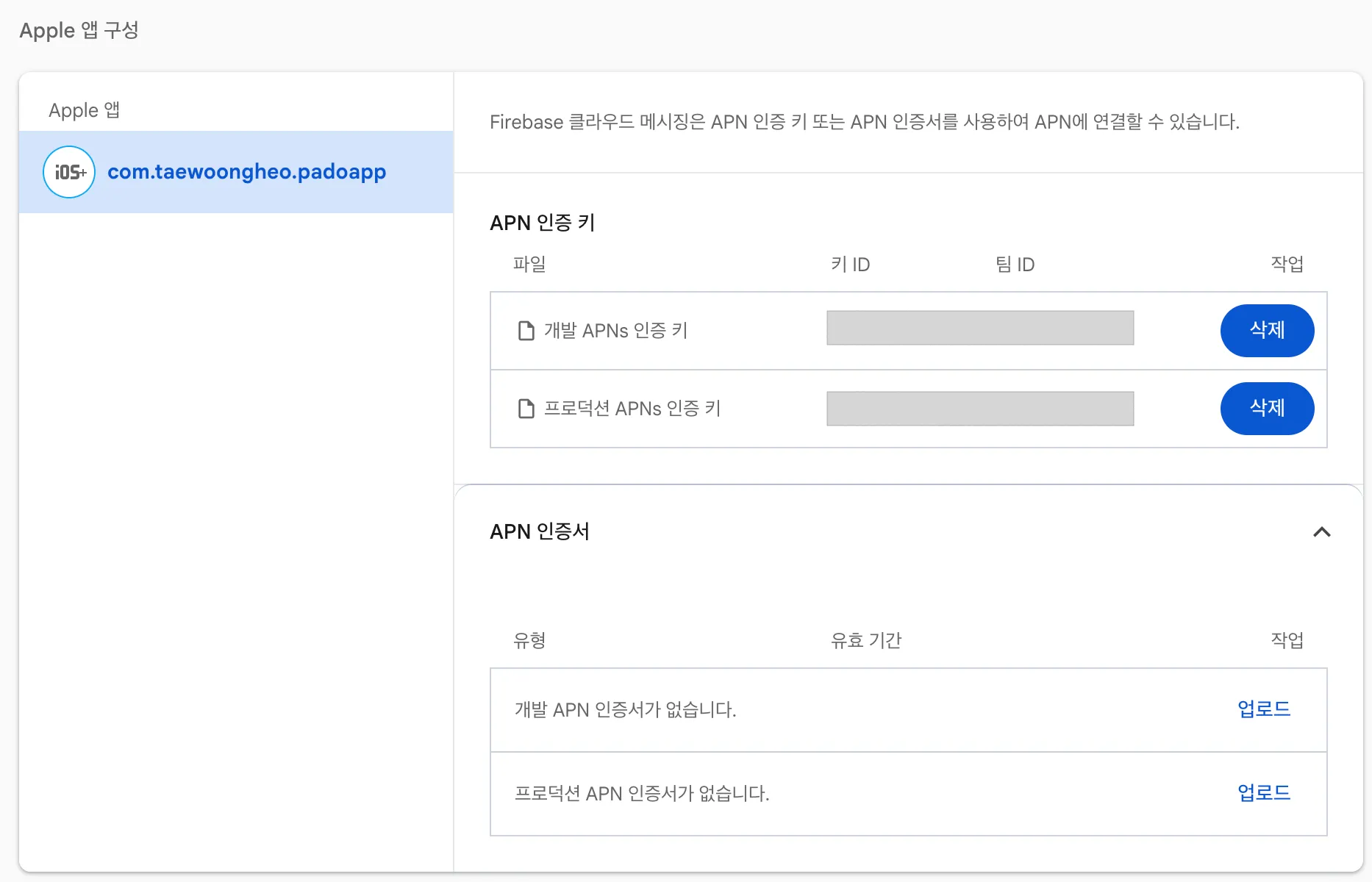 다음으로 “클라우드 메시징” 탭으로 이동한 뒤, FCM 서버에게 이전에 만들었던 키 파일을 전달한다. “Apple 앱 구성” 섹션을 보면 방금 만든 iOS 앱이 있다. 여기서 APN 인증 키 부분에 아까 다운로드 했던 .p8 을 넣어주면 된다. Key ID 와 Team ID 도 입력해준다.