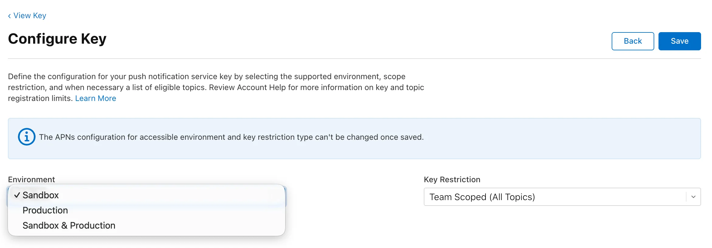 • 이전에 생성한 키(.p8)의 environment 와 일치해야 함