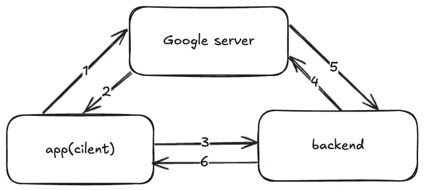 Code Verifierreceived from the backend and compares it with theCode Challengeit stored earlier - 5, 6. if the values match, Google issues the user information to the backend, which then generates a JWT for the app